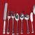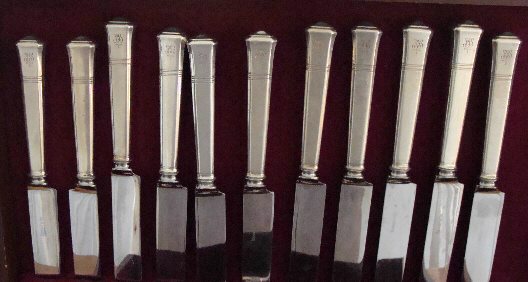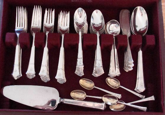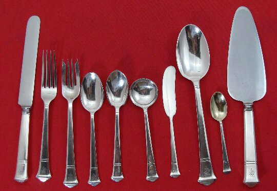 (SOLD)Handsome sterling silver Service for 12 in the elegant Windham pattern by Tiffany. The set consists of the following pieces: 12 6 7/8" Place Fks.; 11 9 1/4" Place Kvs.; 12 6 3/4" Salad Fks.; 12 5 7/8" Tsps.; 12 6" Flat Spreaders; 12 5 3/4" Ice Cream Sps.; 8 5 3/8" Bouillon Sps.; 5 4 3/8" Demis, GW.; 2 8 1/2" Tbsps.; and 1 10" HH. Cake Server - a total of 87 Pieces. The condition is wonderful. There is a pretty intertwined script monogram. Click more images for detail images.