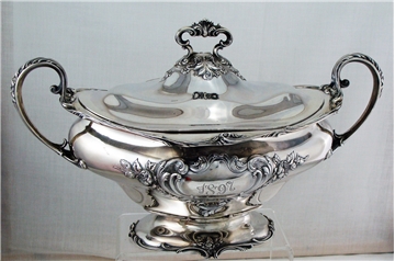 Sterling silver covered soup tureen or vegetable dish, made by Gorham, C.1896. The condition is wonderful; the pattern is clear with nice oxidation. The pattern is very similar to the Gorham Chantilly pattern. The condition is wonderful - There is a very minor ding on the rim of the cover. This 2-handled tureen sits on a short, shaped, oval pedestalled base. The overall height is 9"; the diameter (over the handles) is 14 3/4"; the weight is 58.32 Troy Oz. There is a beautiful date in one cartouche and a beautiful intertwined script monogram in the other. The marks have been photographed. Click on "More Images" above to view.