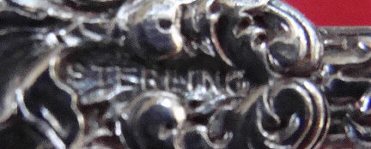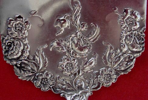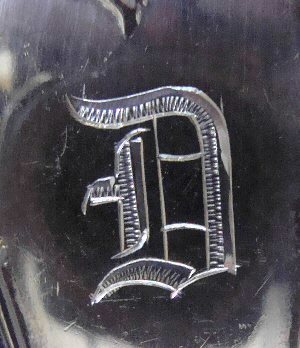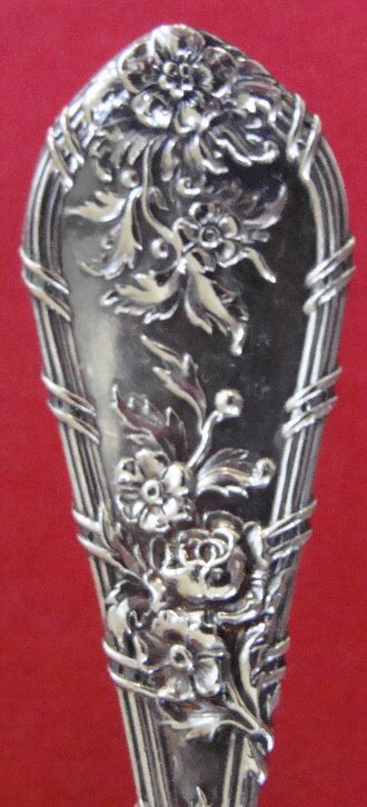 (SOLD)Rare sterling silver waffle server in the Dauphin pattern by Durgin. The length is 8"; the width of the blade is just under 2 3/4". The condition is wonderful. The pattern is crisp with nice oxidation. Notice how the flowers flow from the handle down onto the shaped blade. There is a pretty Gothic monogram D on the reverse of the handle. Click on "More Images" under the above picture to view detail images.