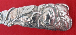 Fabulous HIZEN GRAVY LADLE Sterling Silver by Gorham in the Japanese taste, with cast chrysanthemum and crab on hand hammered handle and chased pomegranate on light gold washed bowl with fluttered rim. the length is 7 3/8". No Monogram and in excellent condition. C1880.