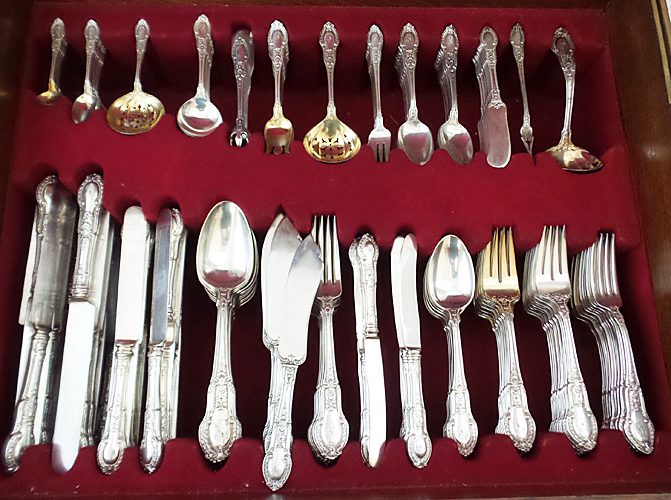 FABULOUS, HUGE sterling silver Gorham Flatware Service for 12 + 23 Serving Pieces - a total of 214 pieces, all in the original fitted box, which sits on a stand, in the handsome Tuilleries pattern. The condition is wonderful! Each piece has a pretty script monogram S. The set consists of the following pieces: 12 each of the following - Dinner Kvs., Dinner Fks., Lunch Kvs., Lunch Fks., Salad Fks., Bouillon Sps., Demitasse Sps., Tablespoons, Fish Fks., Fish Kvs., Cocktail Fks., Ice Cream Fks., Flat Spreaders; 21 Tsps.; 8 Oval Soup/Dessert Sps.; 6 Master Salt Sps.; + (23 Servers Listed)