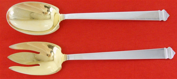 This is a beautiful sterling silver 10 1/8" Gold Washed Salad Set in the handsome Hampton pattern by Tiffany. The condition is very good but with soft surface scratches on the bowl - There has never been a monogram. The marks are TIFFANY & CO. - STERLING - m - PAT.